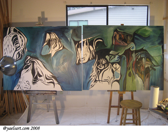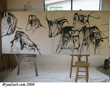 Anyway, the pictures you see here in an update from my studio. These are two canvases of 48″x60″ each. It is not a new technique for me. I have been using it in my painting on and off in varies ways so far. It takes me back to my childhood when I used to scribble with black ink pen on white paper. In this technique, though, I learned as an adult that when I add colors as you can see in the second picture, I have to cover all the white areas before I can start going deep into the images and consider the whole composition. So what you see in this picture is the covering of the white areas. It is only the first layers though. It will change along the way.
